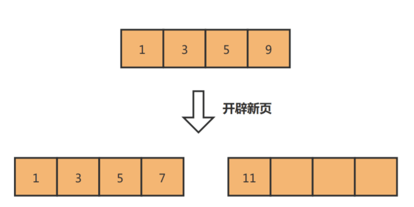 而如果记录是顺序插入的,例如插入数据 11,则只需开辟新的数据页,也就不会发生页分裂: