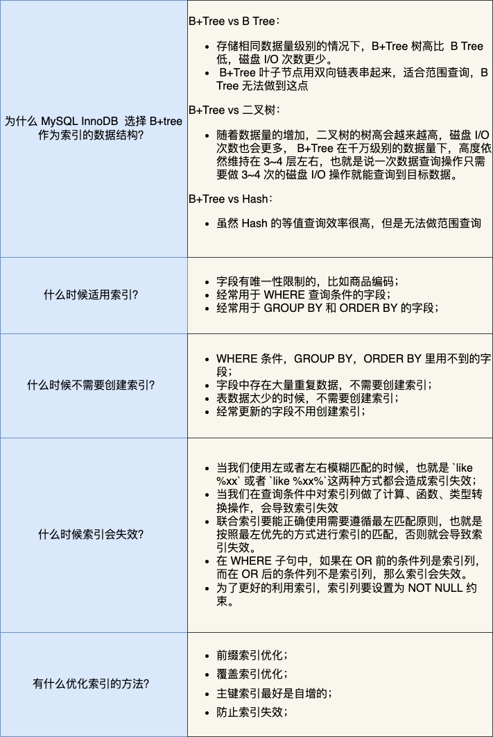 这次主要介绍了索引的原理、分类和使用。我把重点总结在了下面这个表格