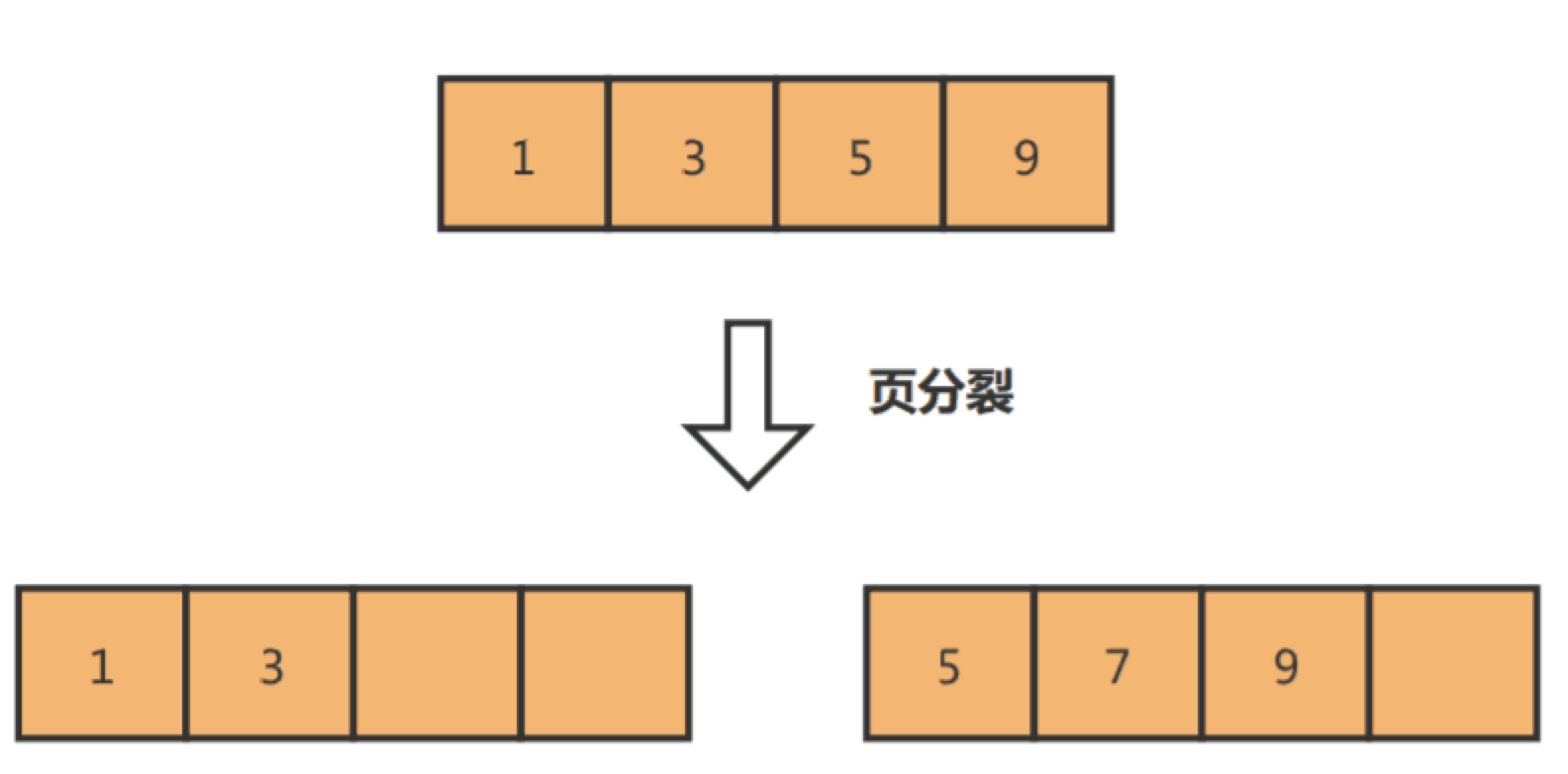 举个例子,假设某个数据页中的数据是 1、3、5、9,且数据页满了,现在准备插入一个数据 7,则需要把数据页分割为两个数据页: