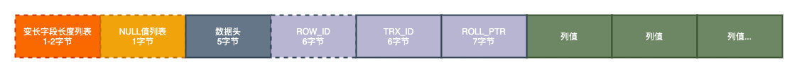 COMPACT,会用 1 字节空间存储 NULL 值列表,如下图的黄色部分:
