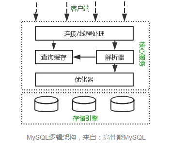 下图是 MySQL 的结构图,索引和数据就是位于存储引擎中: