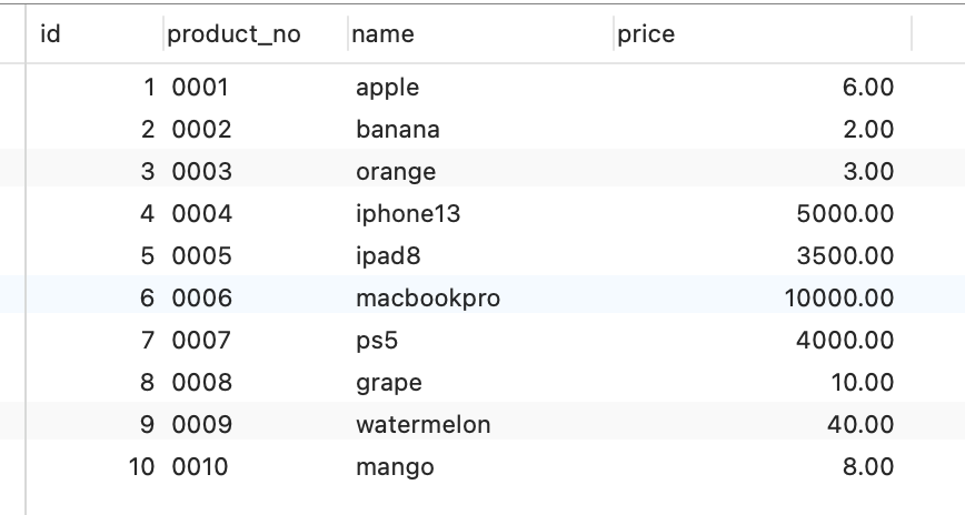 ) CHARACTER SET = utf8 COLLATE = utf8_general_ci ROW_FORMAT = Dynamic;商品表里,有这些行数据:
