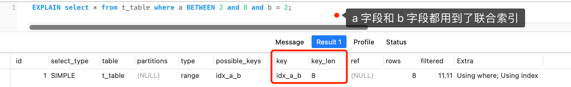 - key 字段表示实际用的索引,如果这一项为 NULL,说明没有使用索引;