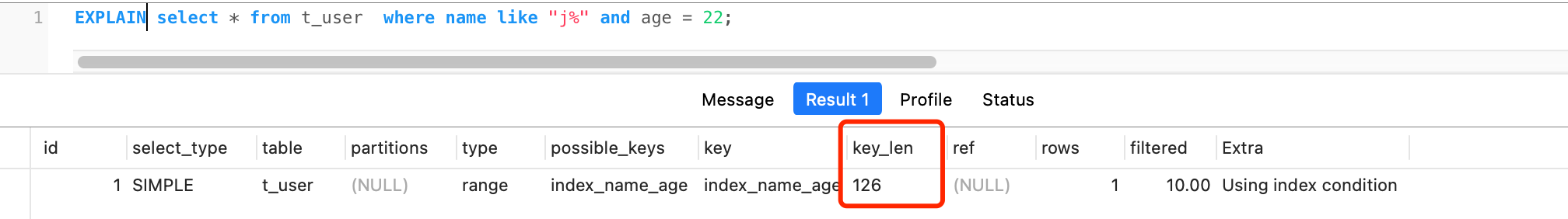 当你的查询语句的执行计划里,出现了 Extra 为 Using index condition,那么说明使用了索引下推的优化。