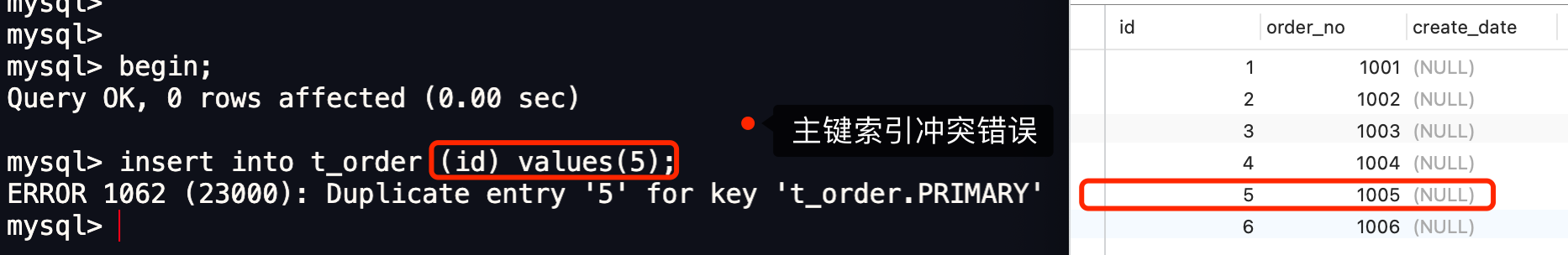 t_order 表中的 id 字段为主键索引,并且已经存在 id 值为 5 的记录,此时有个事务,插入了一条 id 为 5 的记录,就会报主键索引冲突的错误。