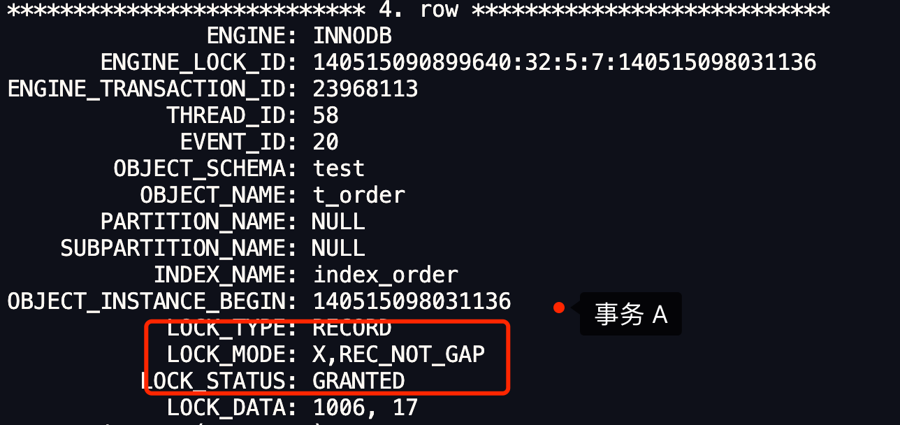 从下图可以看到,事务 A 对 order_no 为 1006 记录加上了类型为 X 型的记录锁(注意,这个是在执行事务 B 之后才产生的锁,没执行事务 B 之前,该记录还是隐式锁)。