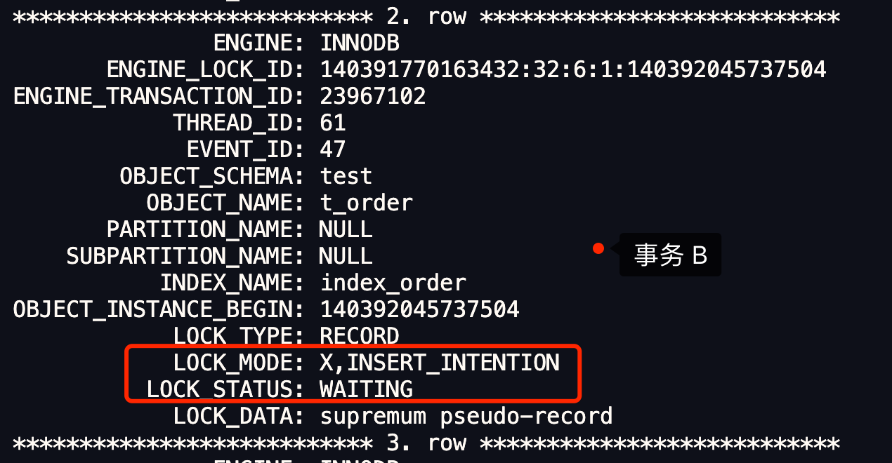 可以看到,事务 B 的状态为等待状态(LOCK_STATUS: WAITING),因为向事务 A 生成的 next-key 锁(记录锁 + 间隙锁)范围(1005, +∞] 中插入了一条记录,所以事务 B 的插入操作生成了一个插入意向锁(LOCK_MODE: X,INSERT_INTENTION),锁的状态是等待状态,意味着事务 B 并没有成功获取到插入意向锁,因此事务 B 发生阻塞。