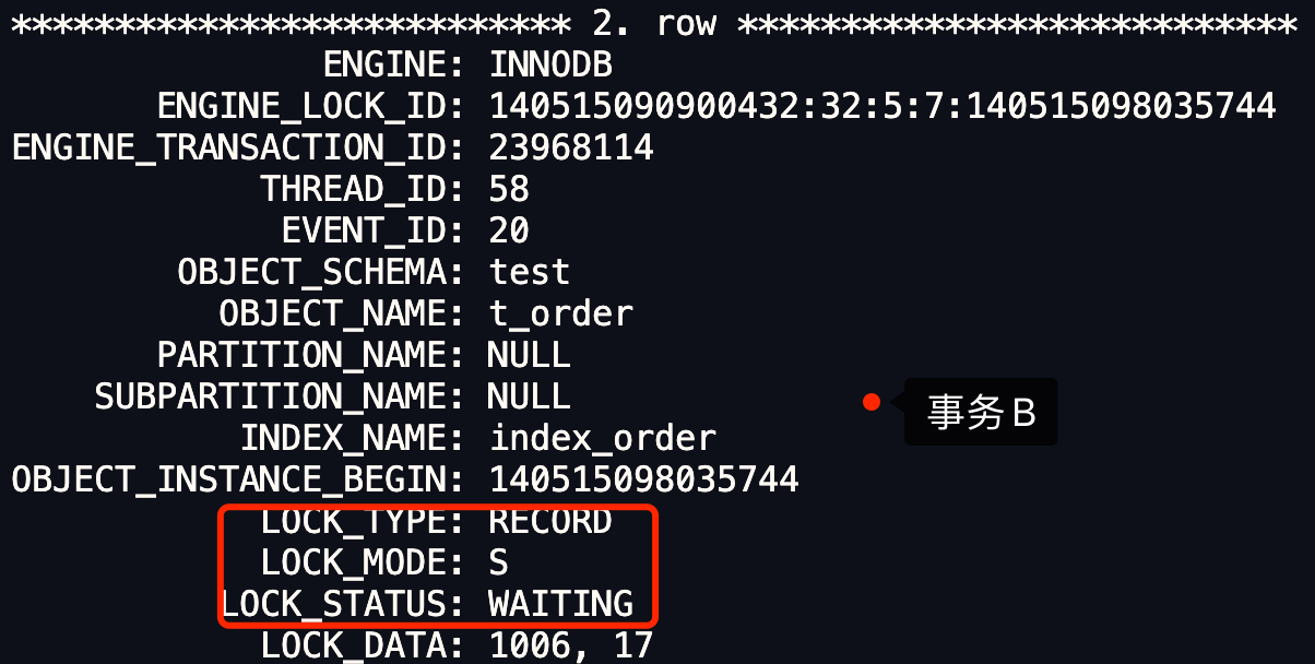 我们也可以从 performance_schema.data_locks 这个表中看到,事务 B 的状态(LOCK_STATUS)是等待状态,加锁的类型 X 型的记录锁(LOCK_MODE: X,REC_NOT_GAP)。