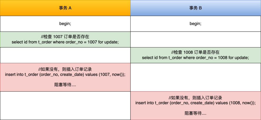 假设这时有两事务,一个事务要插入订单 1007,另外一个事务要插入订单 1008,因为需要对订单做幂等性校验,所以两个事务先要查询该订单是否存在,不存在才插入记录,过程如下: