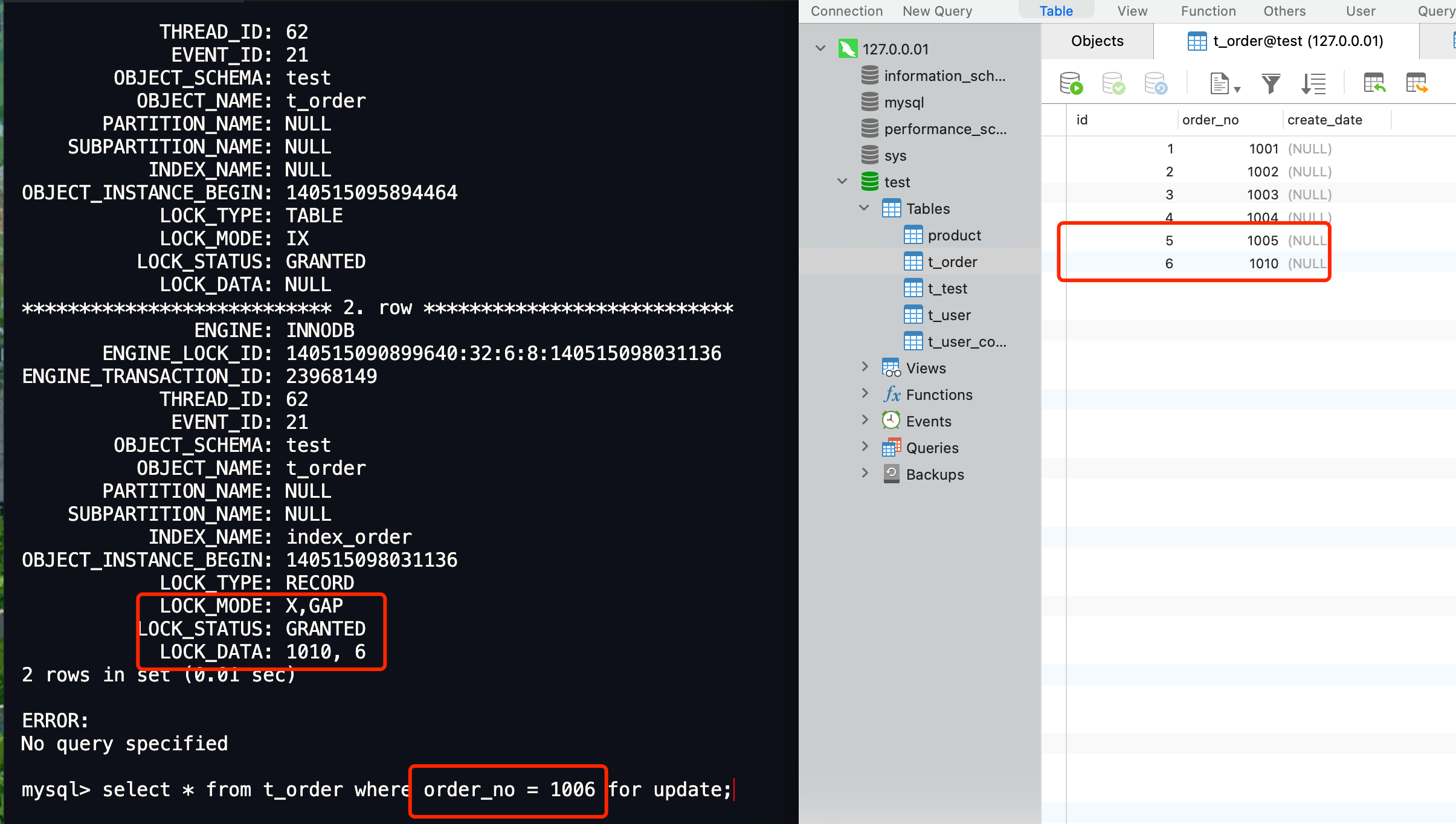 先看事务 A 对 order_no 为 1006 的记录加了什么锁?