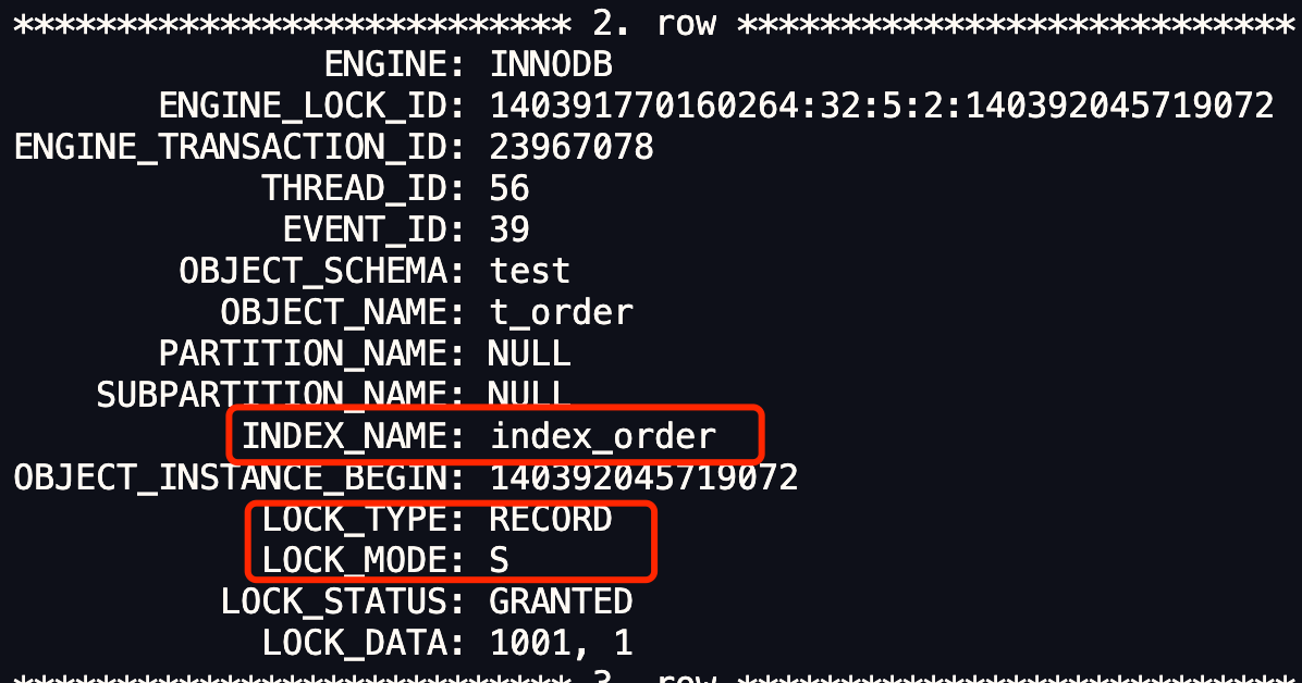 可以看到,index_order 二级索引加了 S 型的 next-key 锁,范围是 (-∞, 1001]。注意,这里 LOCK_TYPE 中的 RECORD 表示行级锁,而不是记录锁的意思。如果是记录锁的话,LOCK_MODE 会显示 S, REC_NOT_GAP。