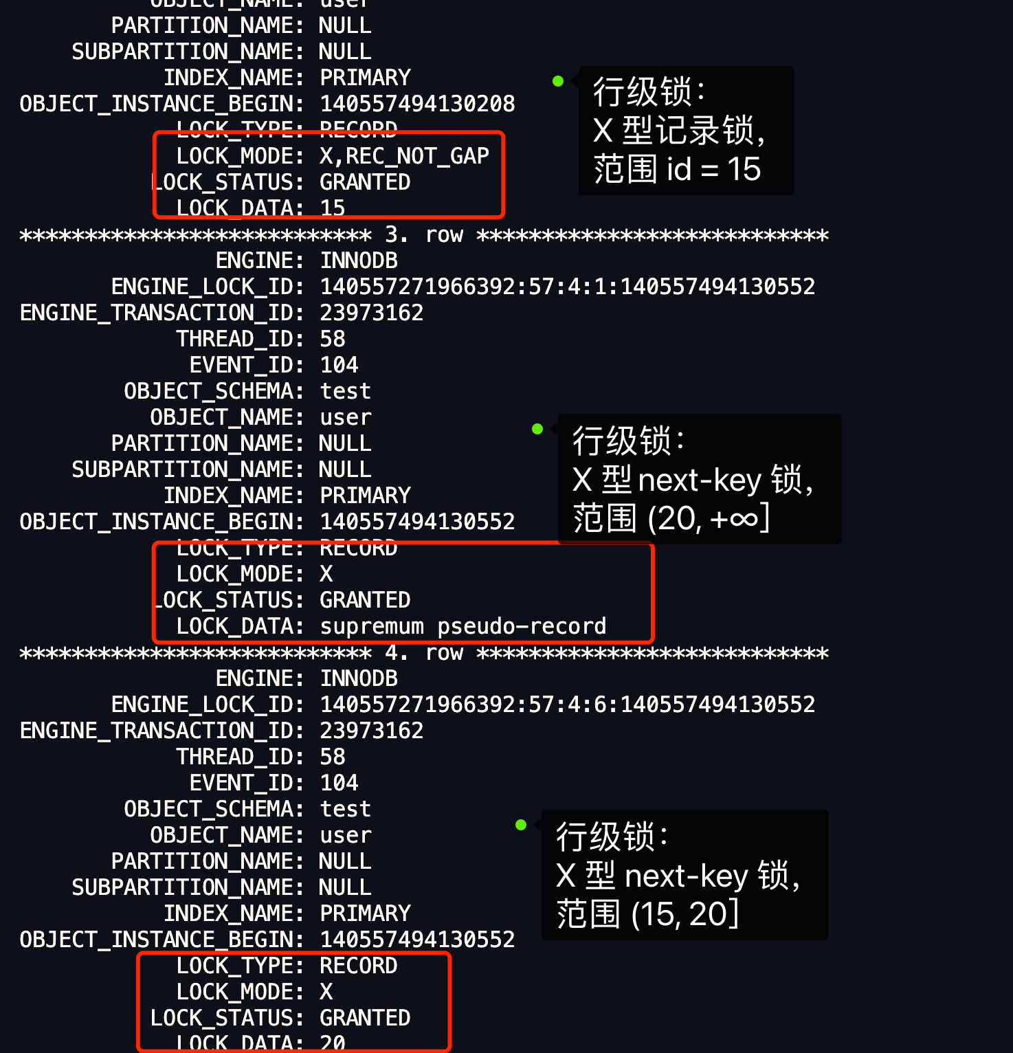 X, REC_NOT_GAP,说明是记录锁; - 如果 LOCK_MODE 为