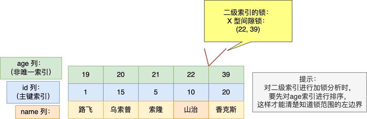 所以,为了避免幻读现象的发生,就需要在二级索引索引上加范围 (22, 39) 的间隙锁。