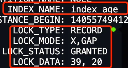 - LOCK_DATA 第一个数值,也就是 39,它代表的是 age 值。从前面我们也知道了,LOCK_DATA 第一个数值是 next-key 锁和间隙锁锁住的范围的右边界值。