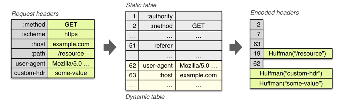 第一点,对于常见的 HTTP 头部通过静态表和 Huffman 编码的方式,将体积压缩了近一半,而且针对后续的请求头部,还可以建立动态表,将体积压缩近 90%,大大提高了编码效率,同时节约了带宽资源。