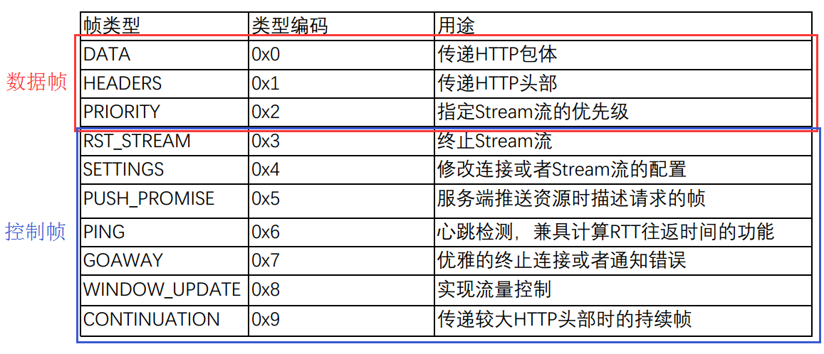 帧长度后面的一个字节是表示帧的类型,HTTP/2 总共定义了 10 种类型的帧,一般分为数据帧和控制帧两类,如下表格: