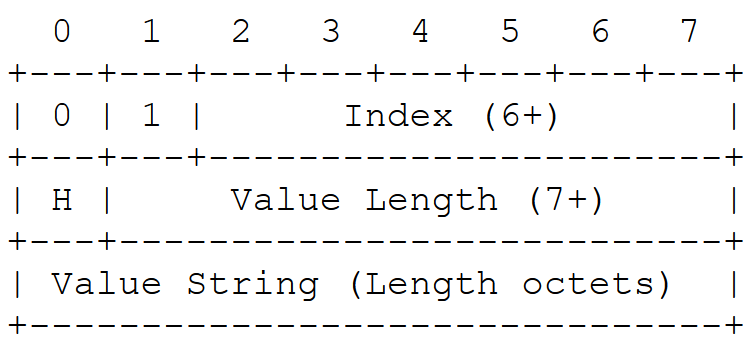 根据 RFC7541 规范,如果头部字段属于静态表范围,并且 Value 是变化,那么它的 HTTP/2 头部前 2 位固定为 01,所以整个头部格式如下图: