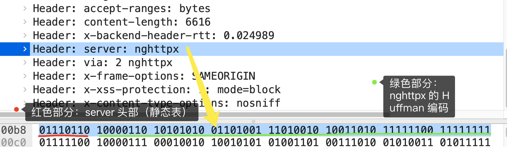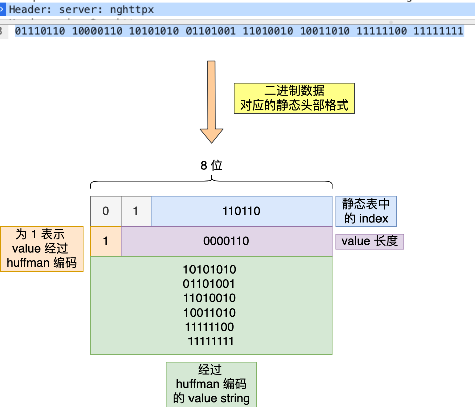 首先,从静态表中能查到 server 头部字段的 Index 为 54,二进制为 110110,再加上固定 01,头部格式第 1 个字节就是 01110110,这正是上面抓包标注的红色部分的二进制数据。