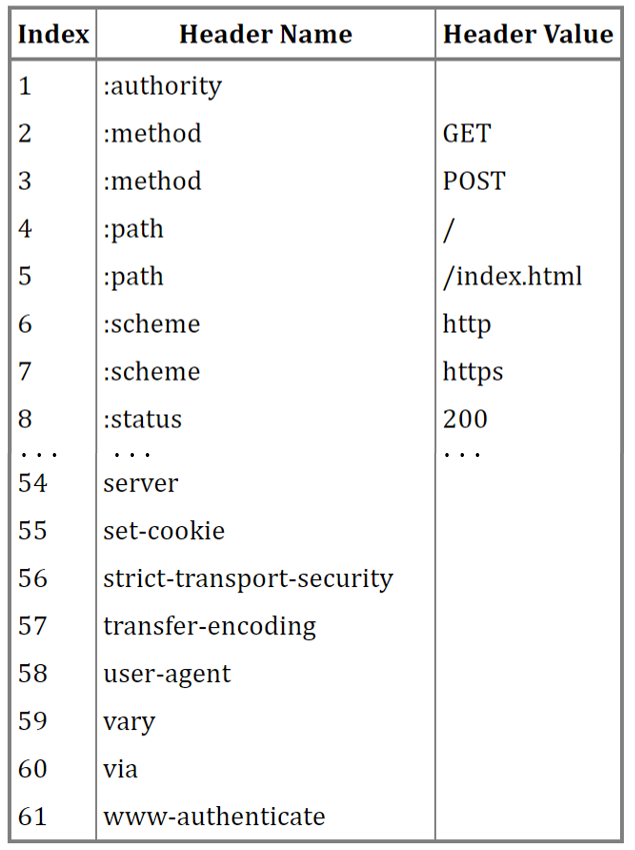 HTTP/2 为高频出现在头部的字符串和字段建立了一张静态表,它是写入到 HTTP/2 框架里的,不会变化的,静态表里共有 61 组,如下图: