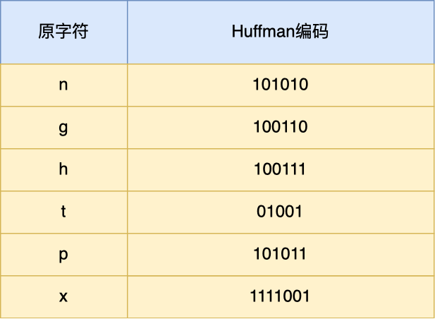于是,在统计大量的 HTTP 头部后,HTTP/2 根据出现频率将 ASCII 码编码为了 Huffman 编码表,可以在 RFC7541 文档找到这张静态 Huffman 表,我就不把表的全部内容列出来了,我只列出字符串 nghttpx 中每个字符对应的 Huffman 编码,如下图: