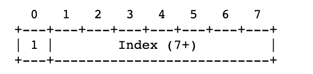 - 最前面的 1 表示该 Header 是静态表中已经存在的 KV。(至于什么是静态表,可以看这篇:HTTP/2 牛逼在哪?)