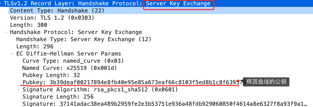 为了保证这个椭圆曲线的公钥不被第三方篡改,服务端会用 RSA 签名算法给服务端的椭圆曲线公钥做个签名。