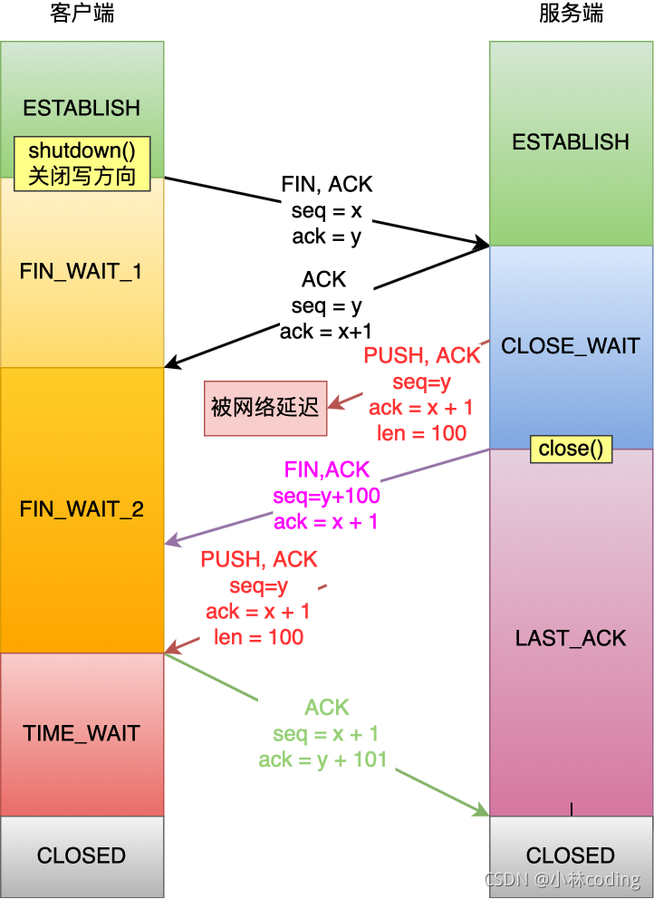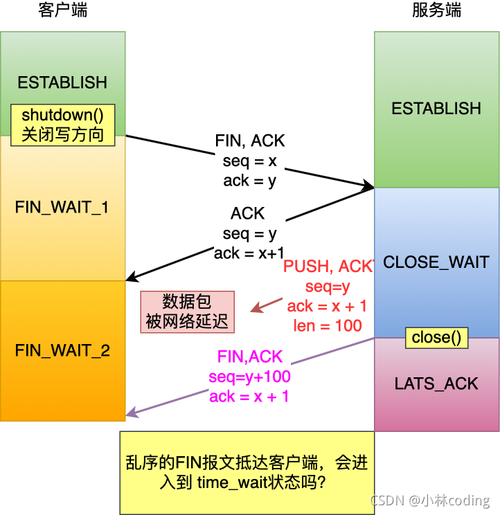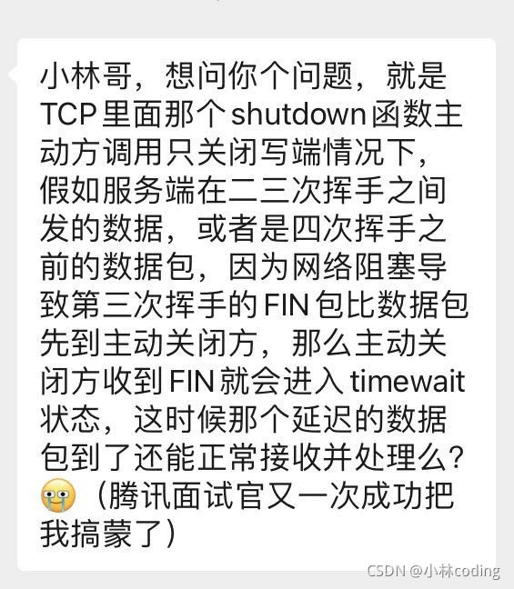 不过这道鹅厂的网络题可能是提问的读者表述有问题,因为如果 FIN 报文比数据包先抵达客户端,此时 FIN 报文其实是一个乱序的报文,此时客户端的 TCP 连接并不会从 FIN_WAIT_2 状态转换到 TIME_WAIT 状态。