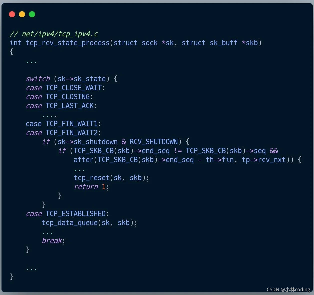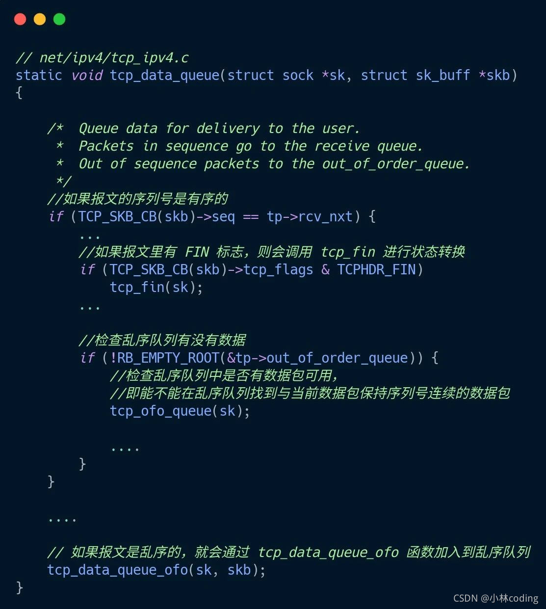 在 Linux 内核里,当 IP 层处理完消息后,会通过回调 tcp_v4_rcv 函数将消息转给 TCP 层,所以这个函数就是 TCP 层收到消息的入口。