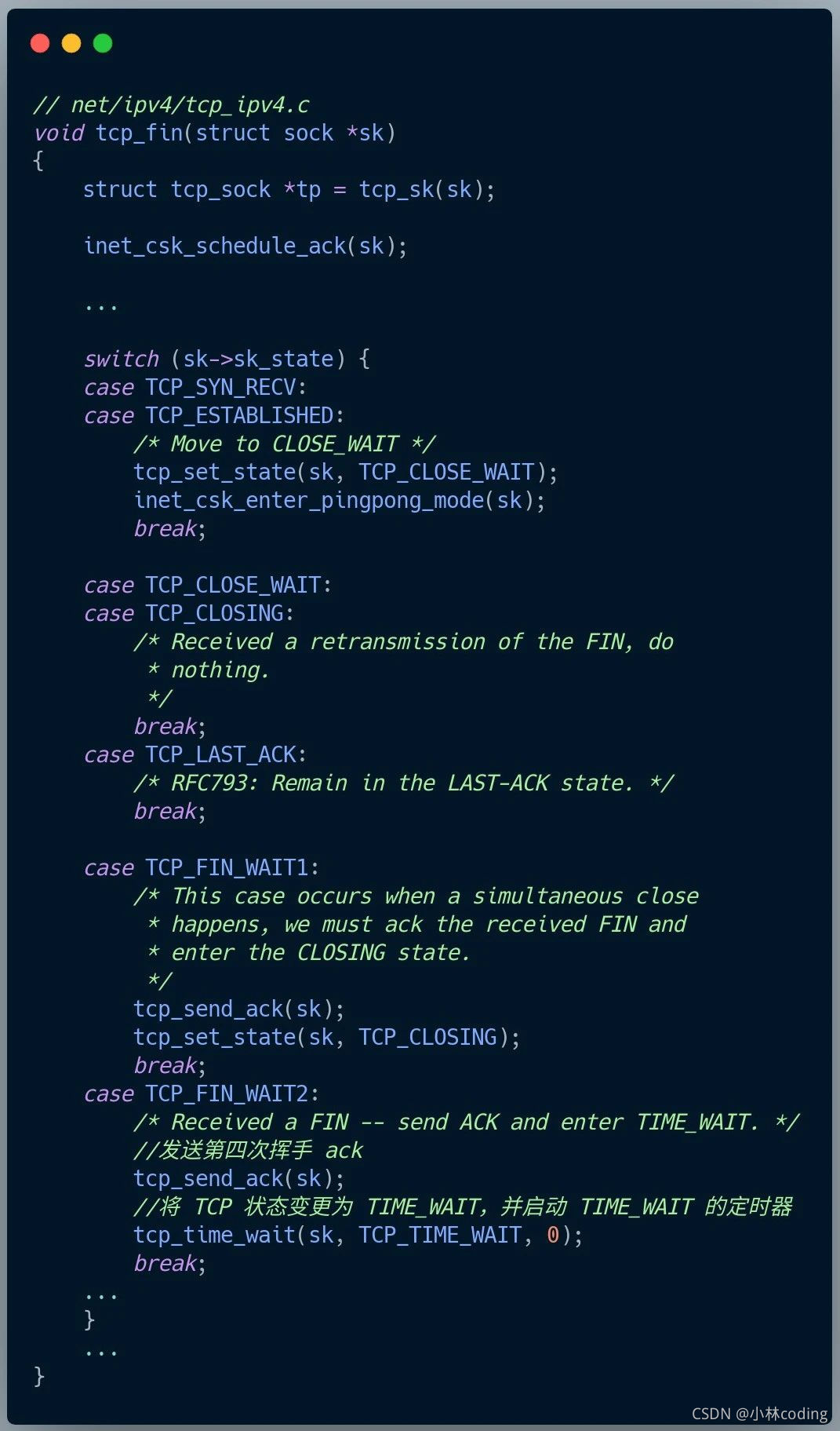可以看到,如果当前的 TCP 状态为 TCP_FIN_WAIT2,就会发送第四次挥手 ack,然后调用 tcp_time_wait 函数,这个函数里会将 TCP 状态变更为 TIME_WAIT,并启动 TIME_WAIT 的定时器。