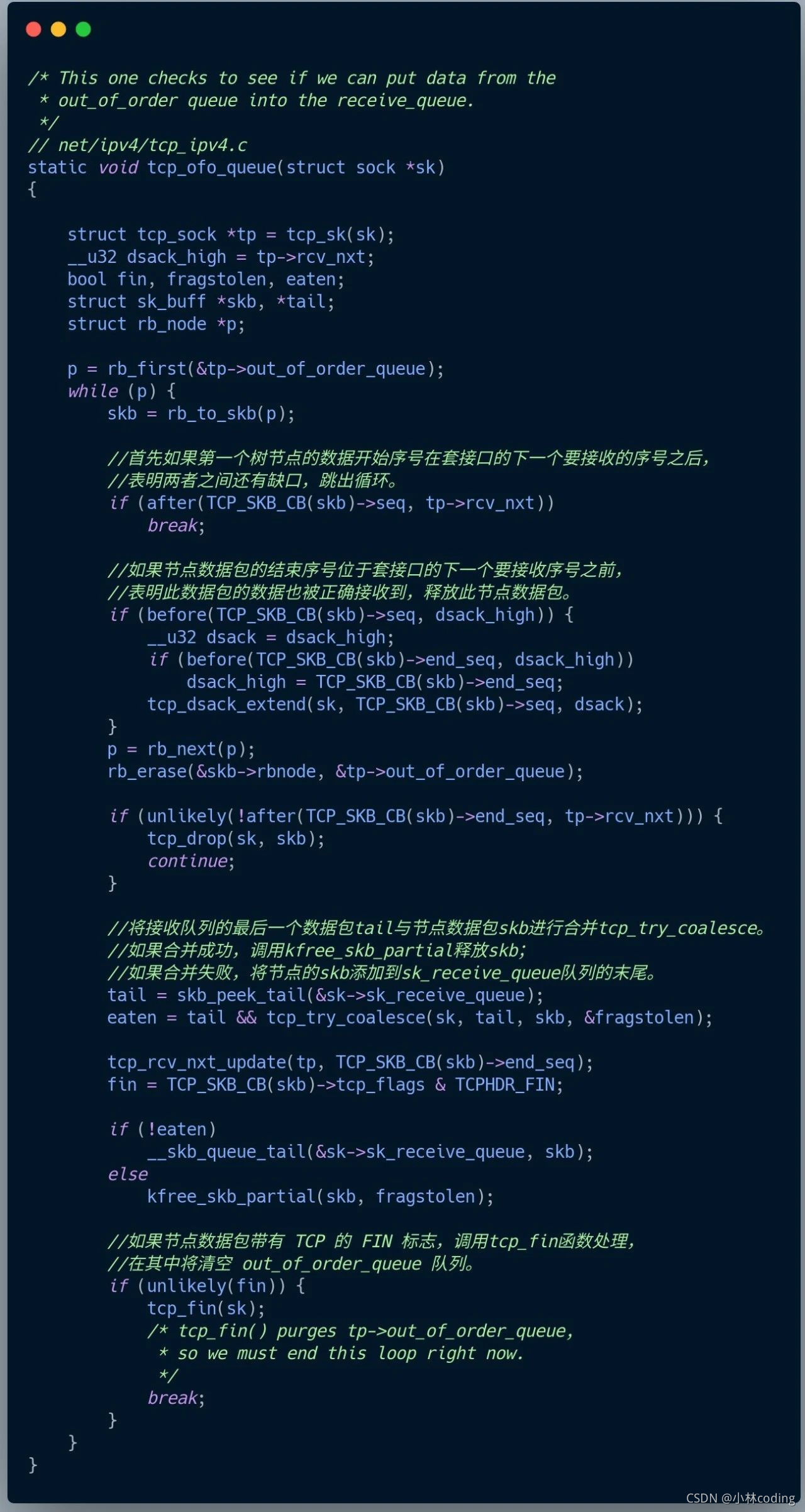 在上面的 tcp_data_queue 函数里,如果收到的报文的序列号是我们预期的,也就是有序的话: