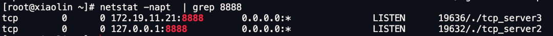 我上面的测试案例是两个 TCP 服务进程同时绑定地址和端口是:0.0.0.0 地址和 8888 端口,所以才出现的错误。