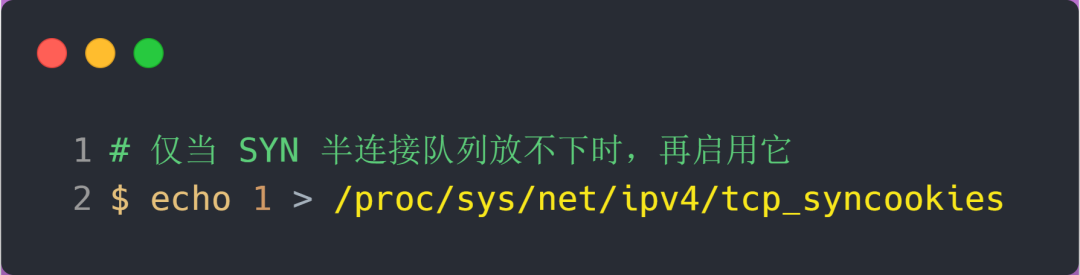 开启 tcp_syncookies 功能的方式也很简单,修改 Linux 内核参数: