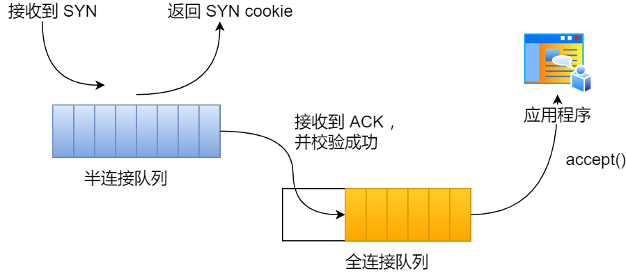 但是,如果开启了 syncookies 功能,即使半连接队列满了,也不会丢弃 syn 包。