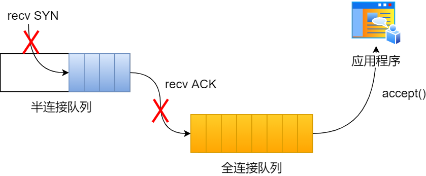 当服务器造成 syn 攻击,就有可能导致 TCP 半连接队列满了,这时后面来的 syn 包都会被丢弃。