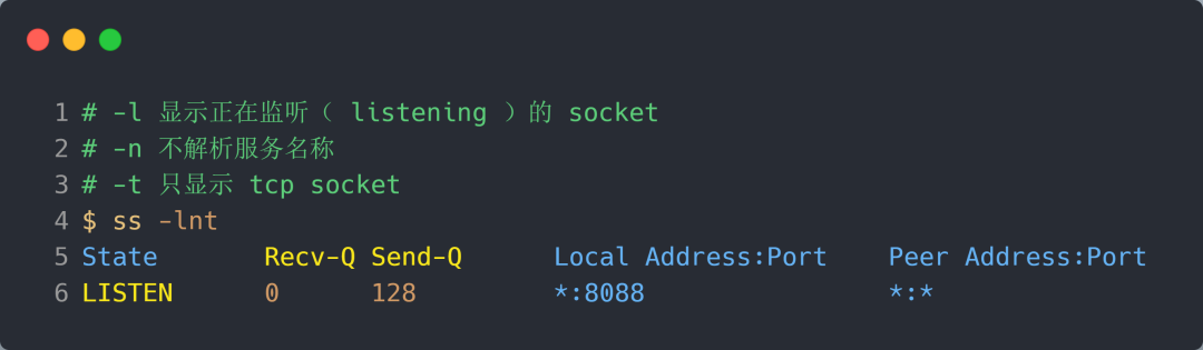 accept()的 TCP 连接个数; - Send-Q:当前 accpet 最大队列长度,上面的输出结果说明监听 8088 端口的 TCP 服务进程,accpet 队列的最大长度为 128;