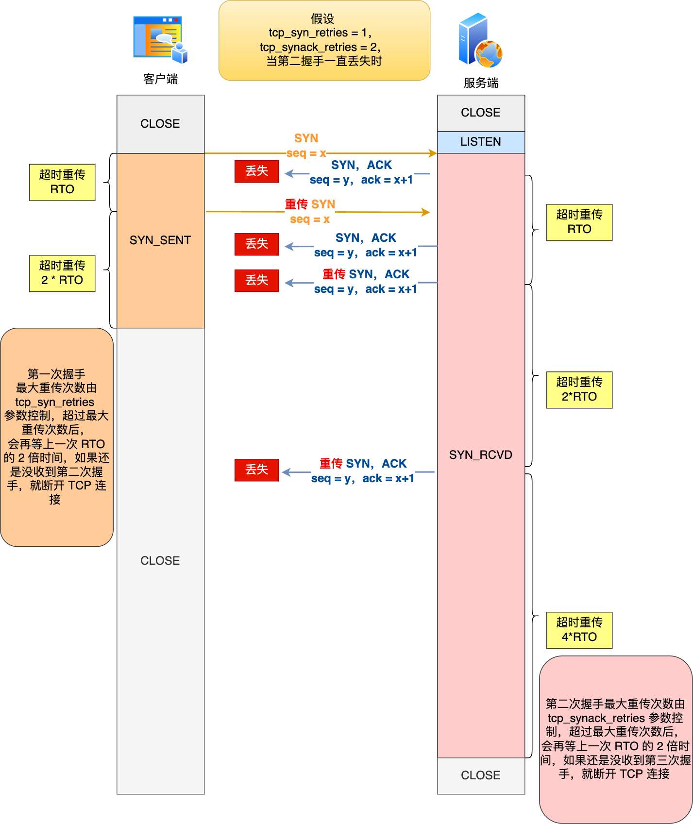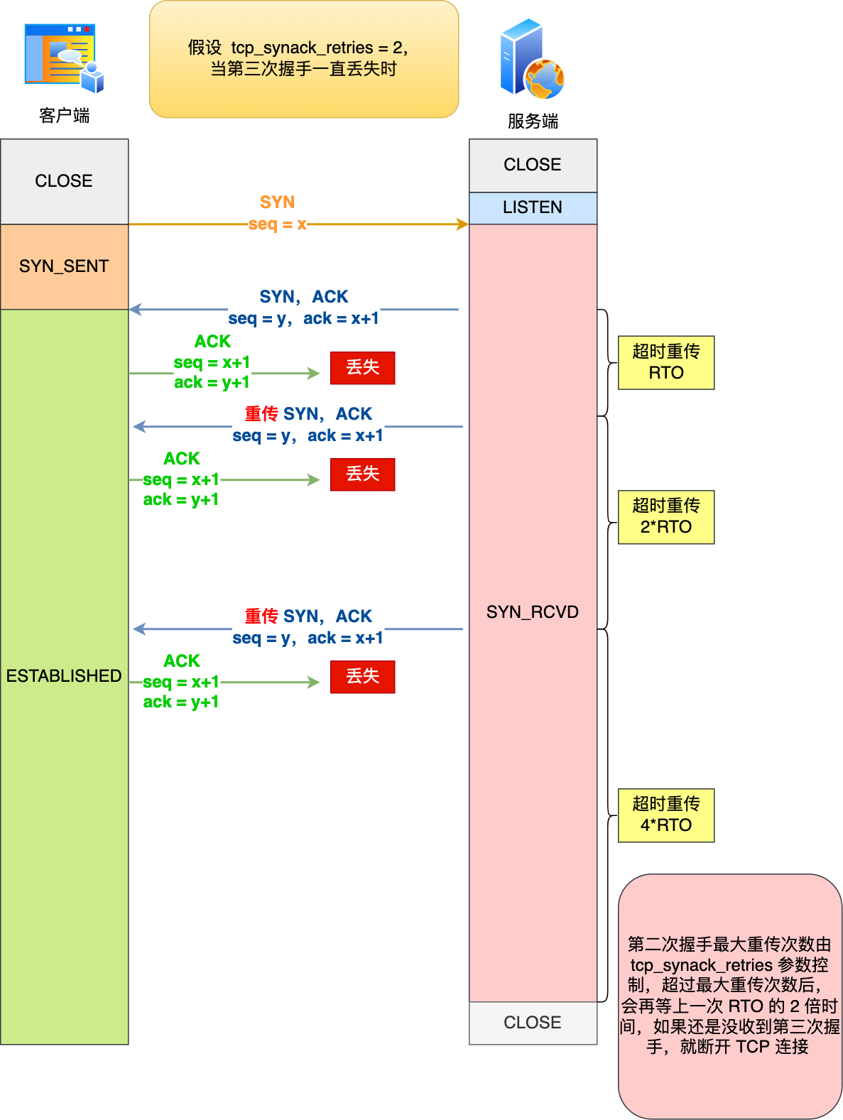 从上面的描述过程,我们可以得知客户端 connect 成功返回是在第二次握手,服务端 accept 成功返回是在三次握手成功之后。