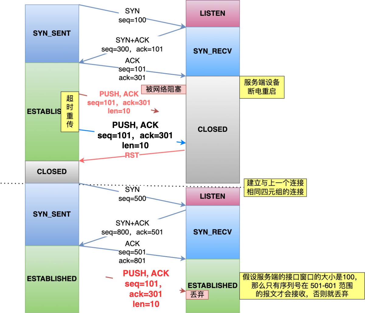 第二种,对端主机宕机并重启。当 TCP 保活的探测报文发送给对端后,对端是可以响应的,但由于没有该连接的有效信息,会产生一个 RST 报文,这样很快就会发现 TCP 连接已经被重置。
