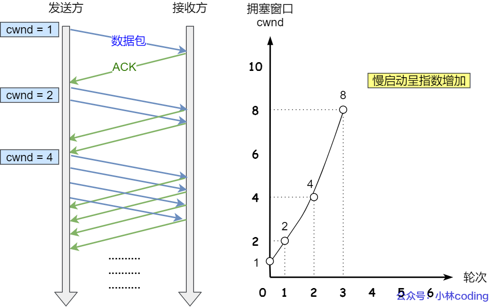 通常,第一次超时重传是在 1 秒后,第二次超时重传是在 2 秒,第三次超时重传是在 4 秒后,第四次超时重传是在 8 秒后,第五次是在超时重传 16 秒后。没错,每次超时的时间是上一次的 2 倍。