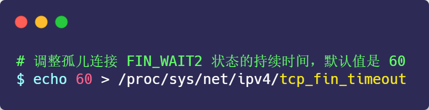 tcp_fin_timeout秒内没有收到对方的 FIN 报文,连接就直接关闭。同时,为了应对孤儿连接占用太多的资源,tcp_max_orphans定义了最大孤儿连接的数量,超过时连接就会直接释放。 - 反之是 shutdown 函数关闭的连接,则不受此参数限制;