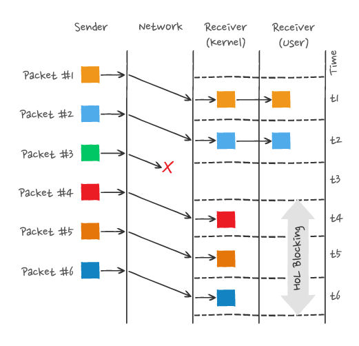 图中发送方发送了很多个 packet,每个 packet 都有自己的序号,你可以认为是 TCP 的序列号,其中 packet #3 在网络中丢失了,即使 packet #4-6 被接收方收到后,由于内核中的 TCP 数据不是连续的,于是接收方的应用层就无法从内核中读取到,只有等到 packet #3 重传后,接收方的应用层才可以从内核中读取到数据。