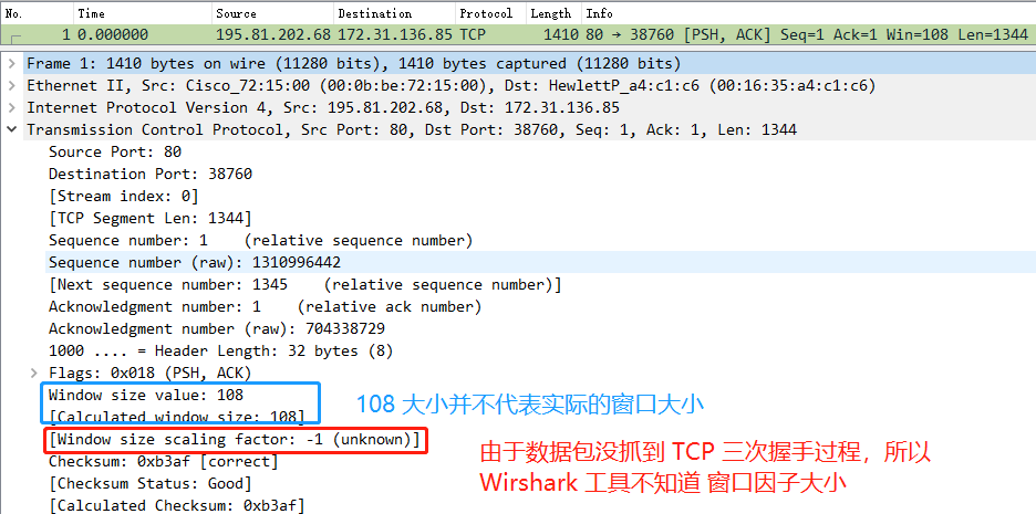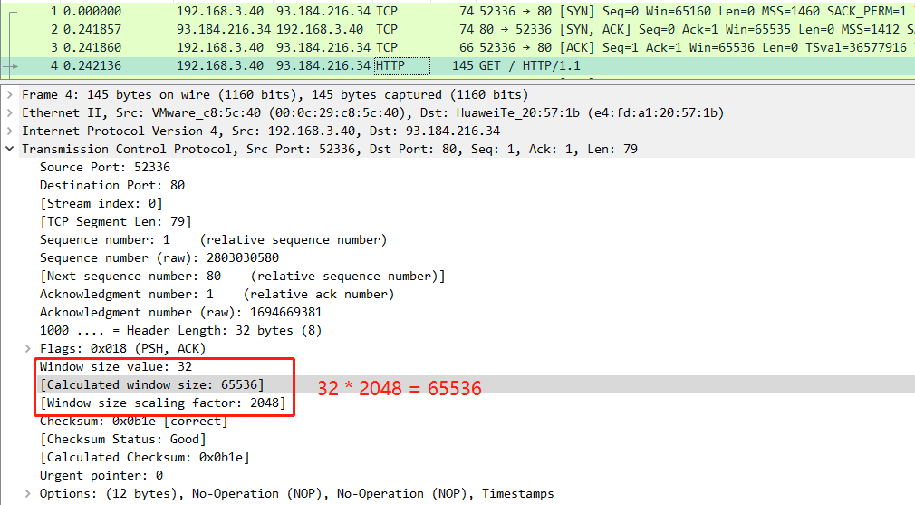 你可能会好奇,抓包文件里有「Window size scaling factor」,它其实是算出实际窗口大小的乘法因子,「Window size value」实际上并不是真实的窗口大小,真实窗口大小的计算公式如下: