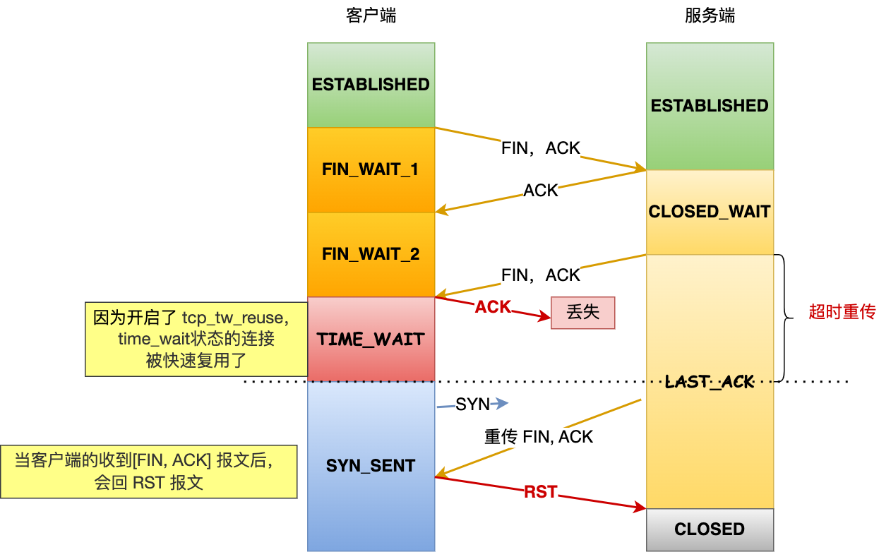 开启 tcp_tw_reuse 来快速复用 TIME_WAIT 状态的连接,如果第四次挥手的 ACK 报文丢失了,服务端会触发超时重传,重传第三次挥手报文,处于 syn_sent 状态的客户端收到服务端重传第三次挥手报文,则会回 RST 给服务端。如下图: