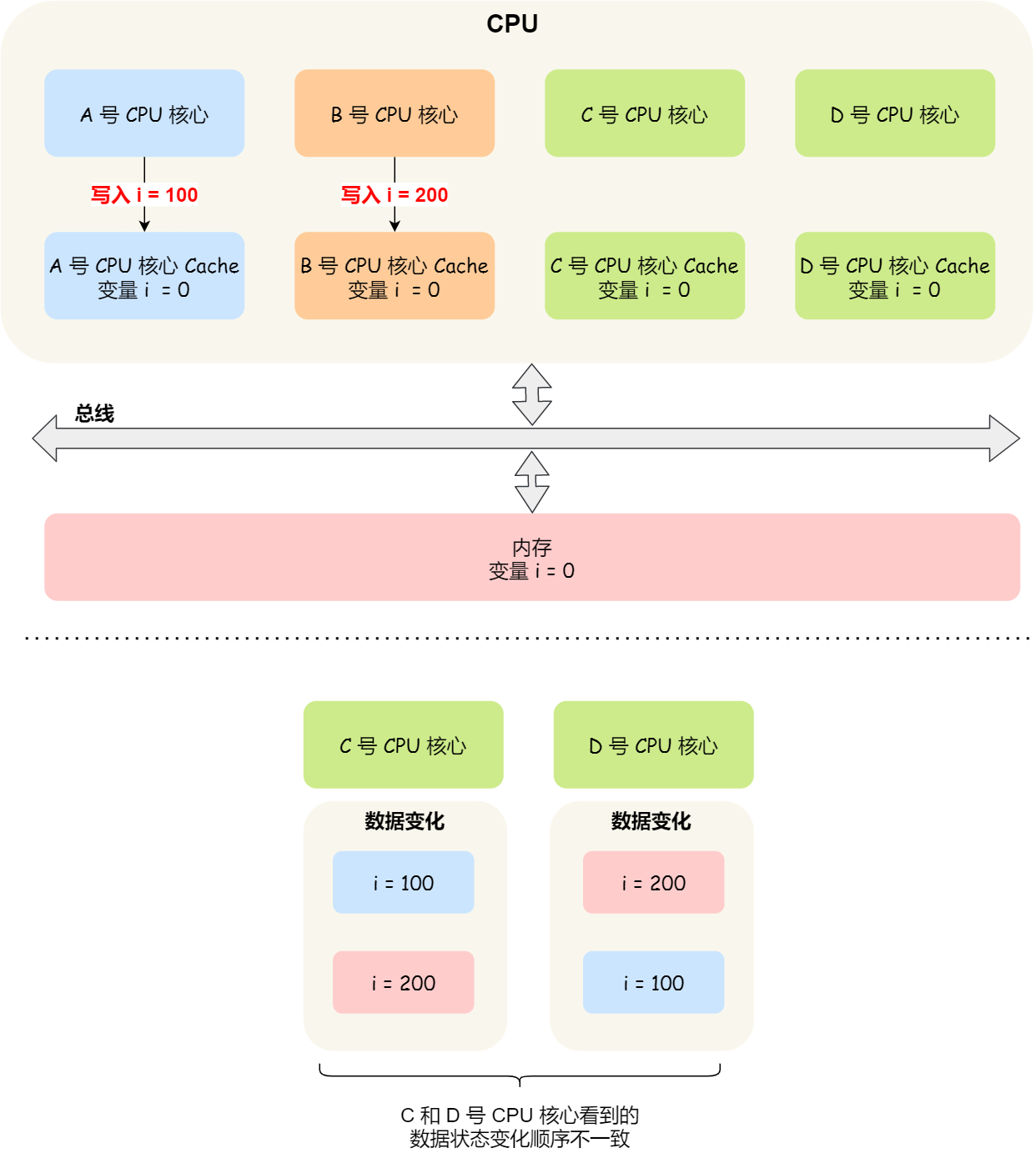 假设我们有一个含有 4 个核心的 CPU,这 4 个核心都操作共同的变量 i(初始值为 0)。A 号核心先把 i 值变为 100,而此时同一时间,B 号核心先把 i 值变为 200,这里两个修改,都会「传播」到 C 和 D 号核心。