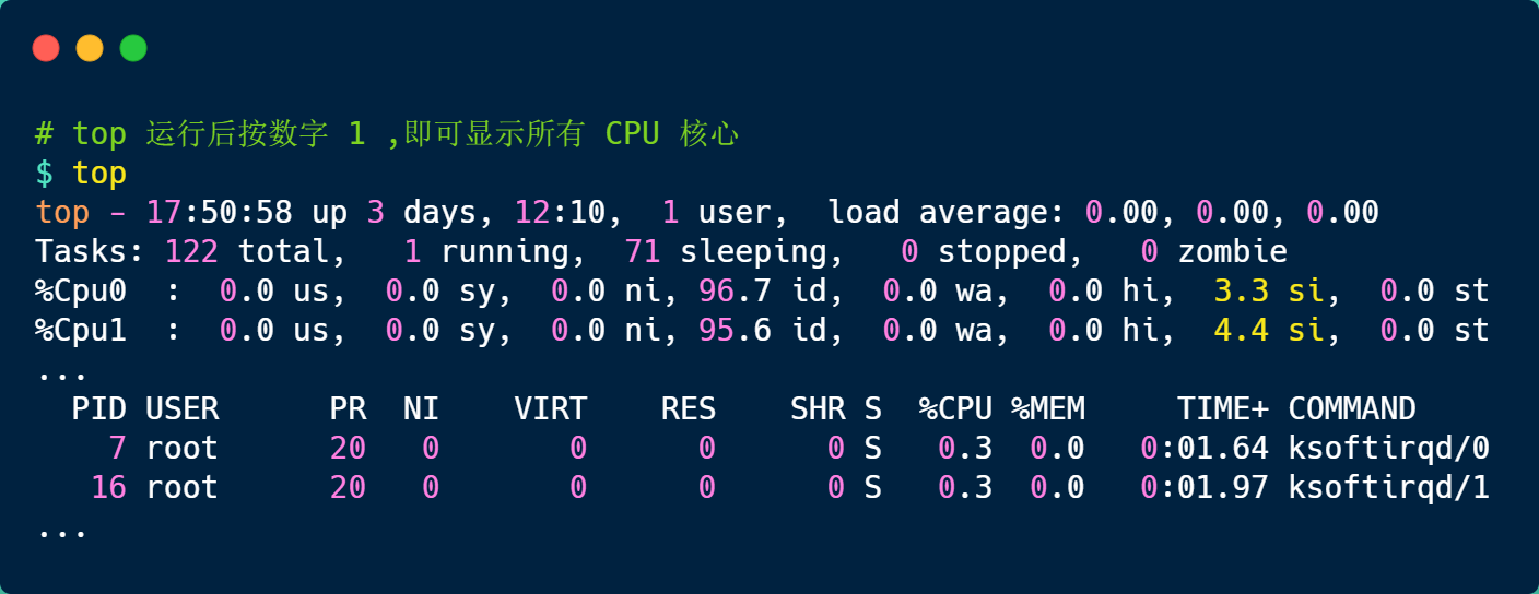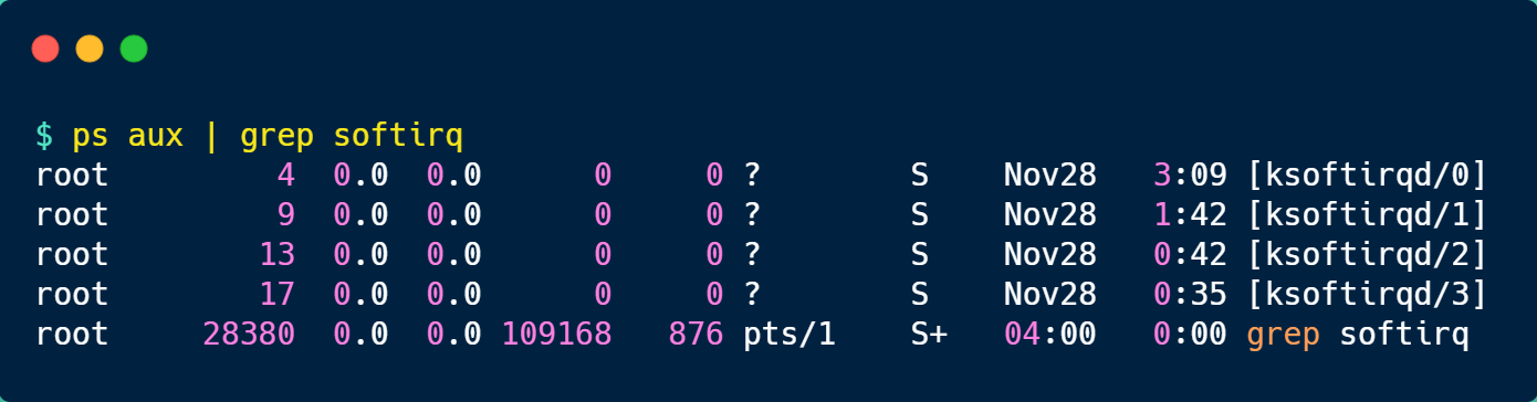 而且,你可以看到有 4 个 ksoftirqd 内核线程,这是因为我这台服务器的 CPU 是 4 核心的,每个 CPU 核心都对应着一个内核线程。