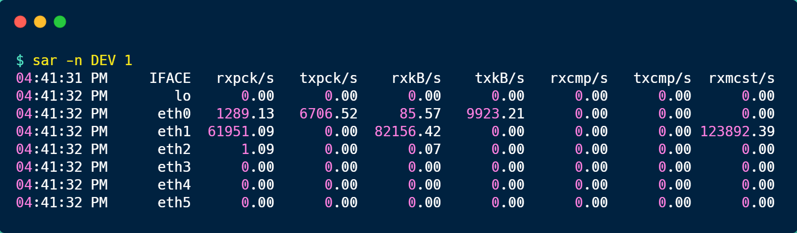 如果发现 NET_RX 网络接收中断次数的变化速率过快,接下来就可以使用 sar -n DEV 查看网卡的网络包接收速率情况,然后分析是哪个网卡有大量的网络包进来。