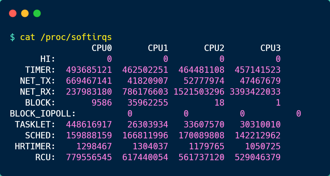在 Linux 系统里,我们可以通过查看 /proc/softirqs 的 内容来知晓「软中断」的运行情况,以及 /proc/interrupts 的 内容来知晓「硬中断」的运行情况。