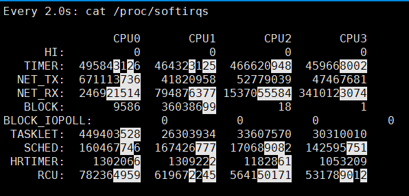 第三点,这些数值是系统运行以来的累计中断次数,数值的大小没什么参考意义,但是系统的中断次数的变化速率才是我们要关注的,我们可以使用 watch -d cat /proc/softirqs 命令查看中断次数的变化速率。