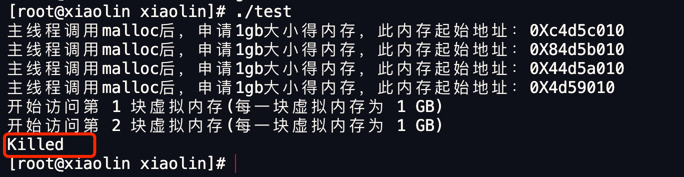 可以看到,在访问第 2 块虚拟内存(每一块虚拟内存是 1 GB)的时候,因为超过了机器的物理内存(2GB),进程(test)被操作系统杀掉了。