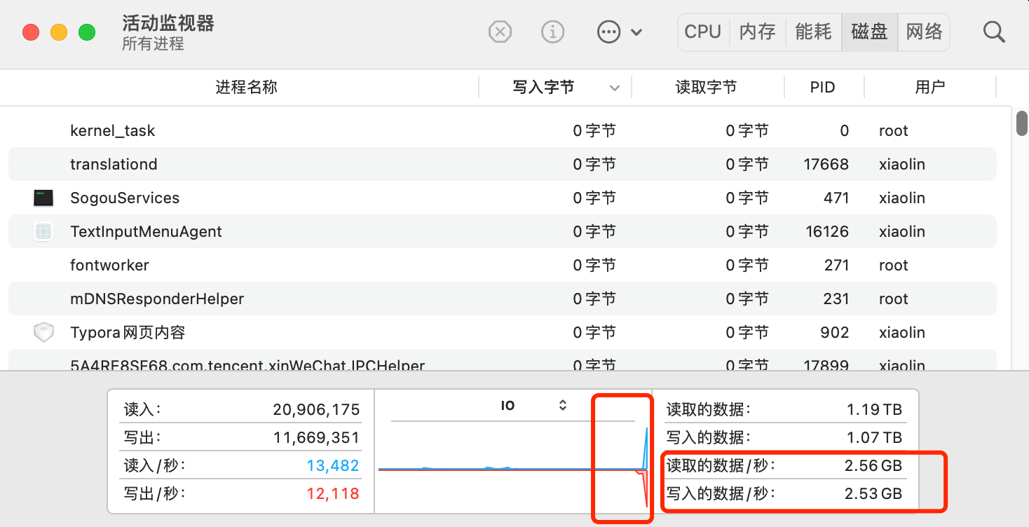 此时我的笔记本电脑的磁盘开始出现“沙沙”的声音,通过查看磁盘的 I/O 情况,可以看到磁盘 I/O 达到了一个峰值,非常高: