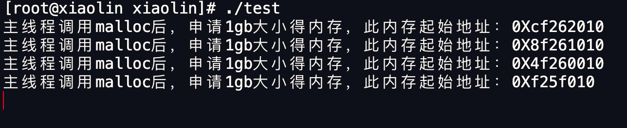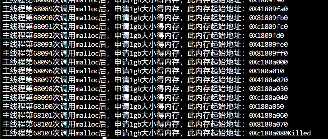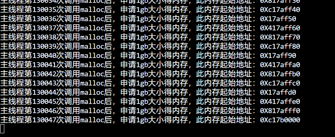 printf("主线程调用 malloc 后,申请 1gb 大小得内存,此内存起始地址:0X%p\n", addr[i]);